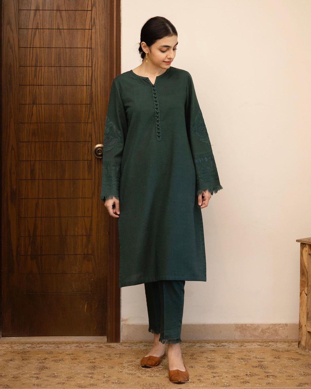Empire Green| 2 pc embroidered stitched outfit on soft khaddar Upgrade your wardrobe with the timeless elegance of Bottle Green's embroidered stitched outfit. Made from soft khaddar, this versatile piece offers both comfort and style. Perfect for any occasion, you'll love the luxurious feel and classic detailing of this outfit. Comfortable and stylish for everyday wear. This set provides versatile options for any occasion. The straight pants create a clean, modern silhouette while the medium-length shirt is designed with both functionality and fashion in mind.